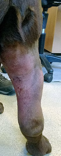Upon presentation on the morning of April 9th, Jack was alert and responsive and his right hind leg was severely edematous from the thigh down to the foot. Significant swelling and edema was also present in the distal left hind limb, scrotum and the ventral chest. The right hind foot was markedly exudative and dripping large amounts of blood tinged serous fluid.