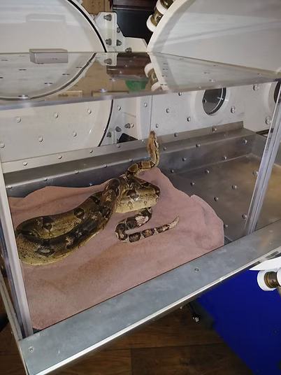 Ace’s Reptile Emporium began soaking the snake in water and chlorahexadine solution mix to help clean the wounds and kept the snake warm and dry. The snake was brought to St. Francis Animal Hospital on 10/25/17 to begin HBOT treatments.